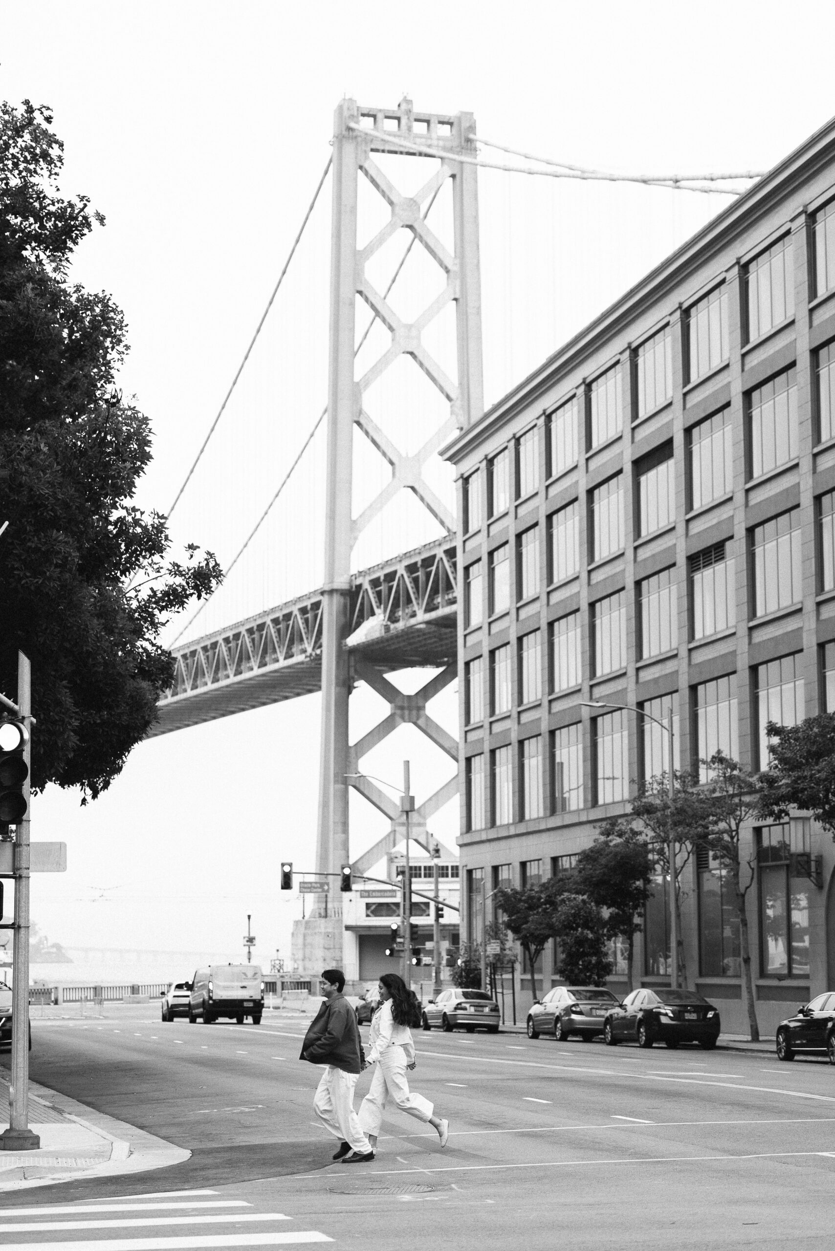 To close the session, we made our way down the Embarcadero to Spear & Harrison—a favorite corner for framing the Bay Bridge without heavy foot traffic. With the morning sun wrapping the bridge cables and soft reflections bouncing off nearby buildings, we finished with clean, modern portraits that feel unmistakably San Francisco. It’s the perfect spot for those “just us + the city” frames: simple, graphic, and timeless.
