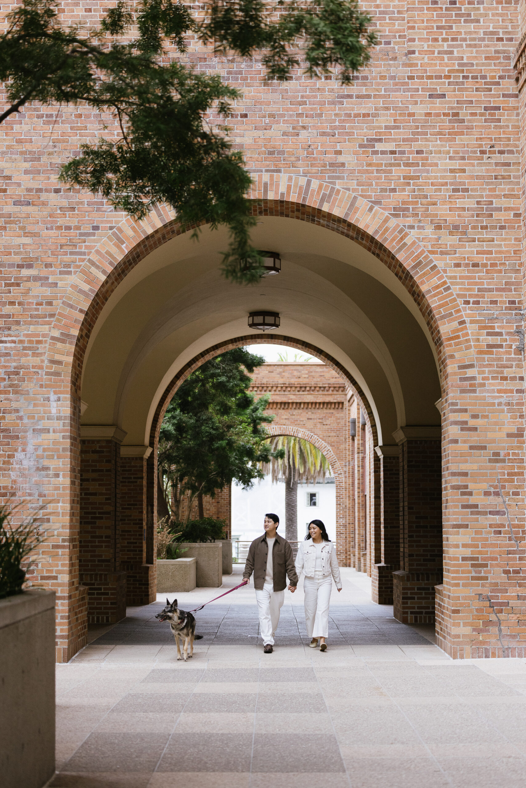 From there, we took a slow walk along the Embarcadero and stopped in front of the Ferry Building—no interiors, just the clock tower and palm-lined sidewalks as an architectural backdrop. The textures here—stone, glass, and that timeless façade—give a totally different look without adding travel time. We mixed in natural movement prompts (a hand-in-hand stroll, a quick spin, a shoulder lean while people-watching) and let the morning rhythm of the city set the tone.